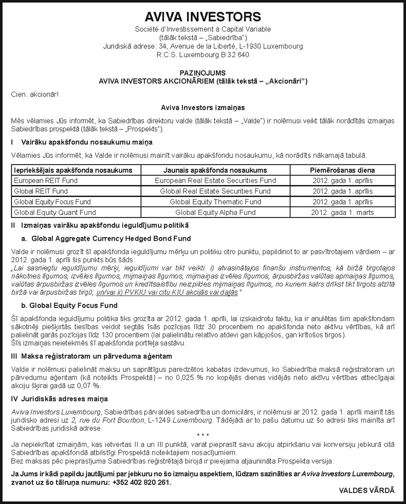 Paziņojumi akcionāriem, dalībniekiem, biedriem. Publicēts oficiālajā laikrakstā "Latvijas Vēstnesis", 29.02.2012., Nr. 34 https://www.vestnesis.lv/ta/id/244698