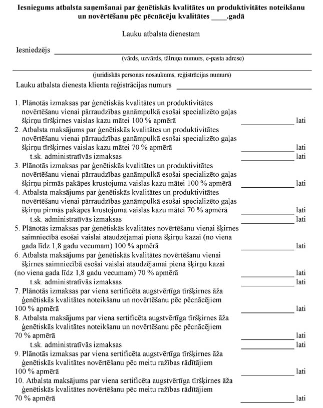 12. Atbalsts sedz līdz 100 procentiem no administratīvajām izmaksām par ciltsgrāmatas uzturēšanu un līdz 70 procentiem no izmaksām, kas saistītas ar veiktajiem testiem (dzīvnieku produktivitātes kontrole un novērtēšana pēc pēcnācēju kvalitātes, darbspēju noteikšana, dzīvnieku lineārā un eksterjera vērtēšana, pāru atlase), lai noteiktu dzīvnieku ģenētisko kvalitāti un produktivitāti, kā arī līdz 100 procentiem no dzīvnieku līķu savākšanas un transportēšanas izmaksām un līdz 75 procentiem no dzīvnieku līķu pārstrādes un likvidēšanas izmaksām.