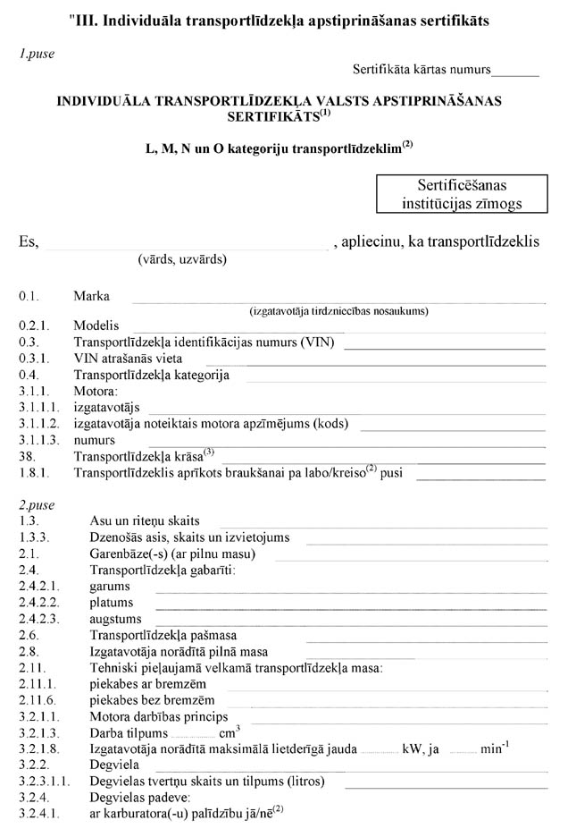 "72. Transportlīdzekļa individuālo apstiprināšanu veic katram no ārvalstīm ievestam vai Latvijā izgatavotam transportlīdzeklim, ja tam nav veikta EK vai valsts tipa apstiprināšana.