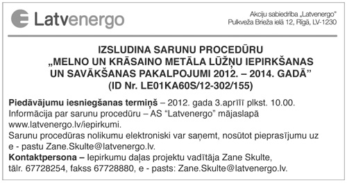SIA "LDZ ritošā sastāva serviss" paziņo, ka 2012.gada 29.martā plkst.10.00 notiks atklātais konkurss "Kravas vagonu bremžu sviru pārvadu rezerves daļu piegāde".
