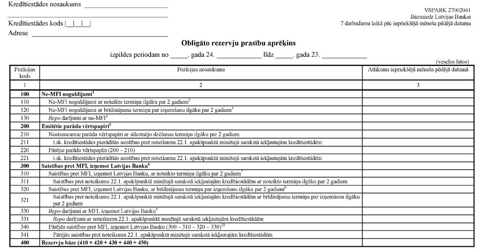 13. Kredītiestāde, kas pakļauta rezervju prasībām, iesniedz "Obligāto rezervju prasību aprēķinu" (pielikums) septiņu darbadienu laikā pēc tā mēneša pēdējā datuma, kam seko mēnesis, kurā sākas izpildes periods.