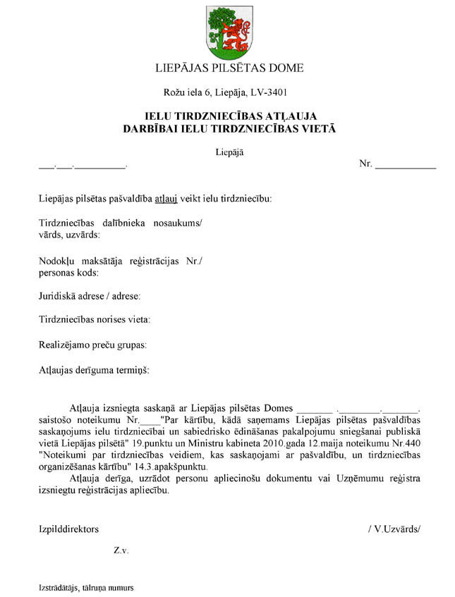 1.1. kārtību, kādā tirdzniecības dalībnieks vai tirdzniecības organizators saskaņo ar Liepājas pilsētas pašvaldību (turpmāk – pašvaldība) tirdzniecības vietas iekārtošanu;