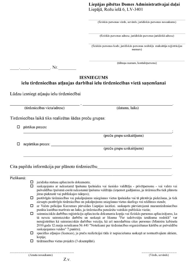 19.2. saskaņojumu ar Liepājas pilsētas Būvvaldi par tirdzniecības vietas dizaina risinājumu (jāiesniedz tikai tad, ja tirdzniecības vietas iekārtošanai tiek izmantots tirdzniecības veicēja īpašumā esošs, iznomāts vai patapināts tirdzniecības vietas aprīkojums vai arī tirdzniecība tiek veikta no speciālām iekārtām, izņemot gadījumus, ja tirdzniecības vieta iepriekš saskaņota Liepājas pilsētas Būvvaldē kā projekts ar tirdzniecības vietas aprīkojuma piesaisti konkrētajai vietai dabā). Liepājas pilsētas Būvvaldē ielu tirdzniecības vietas saskaņošanai jāiesniedz projekts, kura sastāvā iekļauta vietas fotofiksācija, objekta novietne situācijas plānā M 1:500 un tirdzniecības vietas dizains (projekts vai fotofiksācija).