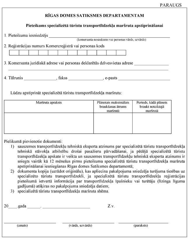 8. Lai apstiprinātu specializētā tūristu transportlīdzekļa maršrutu, personai, kura plāno veikt pasažieru pārvadāšanu ar specializēto tūristu transportlīdzekli (turpmāk – pakalpojuma sniedzējs), jāiesniedz Rīgas domes Satiksmes departamentā: