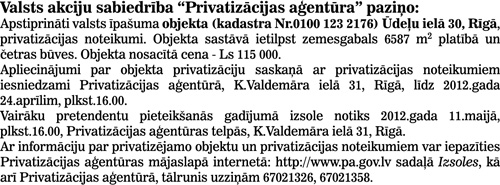 Privatizācijas ziņas. Publicēts oficiālajā laikrakstā "Latvijas Vēstnesis", 29.03.2012., Nr. 51 https://www.vestnesis.lv/ta/id/246007