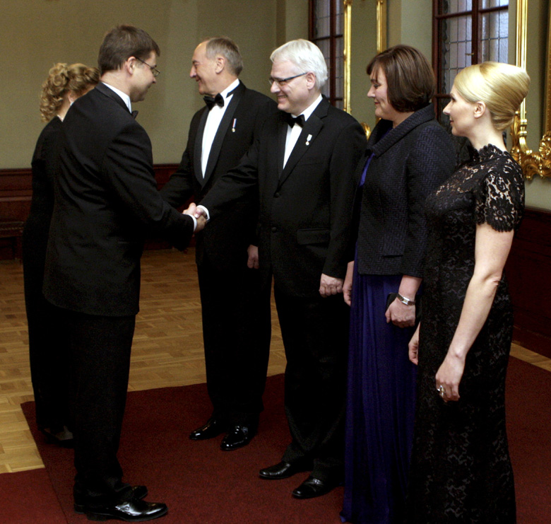 Pirmdien, 2.aprīlī, Melngalvju namā Latvijas Valsts prezidents par godu Horvātijas prezidenta valstsvizītei Latvijā rīkoja valsts vakariņas, uz kurām lūgtos viesus, tostarp Ministru prezidentu Valdi Dombrovski, sagaidīja Valsts prezidents Andris Bērziņš ar kundzi Daci Seisumu un Horvātijas prezidents Ivo Josipovičs ar kundzi Tatjanu Josipoviču (attēlā;). Kā ziņots, Horvātijas prezidenta vizīte aizsākās 2.aprīlī ar oficiālo sagaidīšanas ceremoniju pie Rīgas pils (skat. "LV" Nr.53, 03.04.2012.). Savukārt vakar, pēdējā vizītes dienā, Latvijas Universitātes 90.jubilejas gadā iedibinātā lekciju cikla "Pasaules līderu lasījumi" ietvaros Horvātijas prezidents Ivo Josipovičs universitātē nolasīja lekciju "Horvātija Eiropas Savienībā un reģionā – vienas monētas divas puses" ("Croatia in European Union and region – two sights of the same coin"). Noslēdzot vizīti, Horvātijas prezidents Rīgas pilī tikās ar Saeimas priekšsēdētāju Solvitu Āboltiņu, Saeimas Ārlietu komisijas vadītāju Ojāru Ēriku Kalniņu, Ministru prezidentu Valdi Dombrovski un ārlietu ministru Edgaru Rinkēviču Foto: VPK |