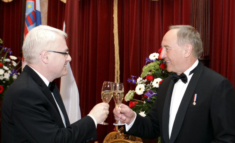 Horvātijas Republikas prezidents Ivo Josipovičs un Latvijas Republikas Valsts prezidents Andris Bērziņš, valsts vakariņu laikā 2.aprīlī Melngalvju namā uzsaucot tostu "Par Horvātijas labklājību, par Latvijas un Horvātijas draudzību un vēl ciešāku sadarbību jau tuvākajā nākotnē!" Foto: VPK |