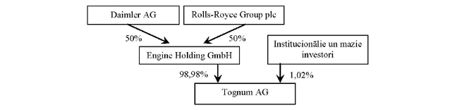 1.1. Tognum AG ir Vācijā reģistrēta sabiedrība, reģistrēta Ulmas Pirmās instances tiesas uzņēmumu reģistrā ar Nr. HRB 721056, juridiskā adrese: Mabachplatz 1, 88040, Firedrichshafen, Vācija, kura ir divu sabiedrību – Daimler AG un Rolls-Royce Group plc – kontrolēts uzņēmums: abas sabiedrības ir vienīgās dalībnieces (katrai 50% kapitāldaļu) sabiedrībā Engine Holding GmbH, kurai, savukārt, ir izšķiroša ietekme sabiedrībā Tognum AG (99,98% kapitāldaļu pieder Engine Holding GmbH; 1,02% kapitāldaļu pieder institucionāliem un mazajiem investoriem) (skatīt attēlu Nr.1).