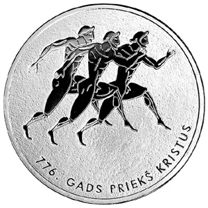 Monētas aizmugure (reverss): Centrā triju antīko grieķu skrējēju stilizētas figūras, zem tām puslokā pa labi uzraksts 776. GADS PRIEKŠ KRISTUS. Monētas josta: |