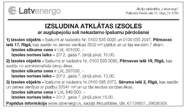 1) nekustamo īpašumu - zemesgabalu, kas atrodas Rīgā, Sējas ielā, kadastra numurs 0100 106 2341, ar kopējo platību 1620 kv.m, uz kura atrodas citām personām piederošas dzīvojamās ēkas daļa, pagrabs un transformators. Nekustamā īpašuma novērtējums un izsoles sākumcena Ls 8000, kas nav apliekama ar pievienotās vērtības nodokli. Pirmā izsole ar augšupejošu soli notiks 2012.gada 30.maijā plkst.11.00 Valmierā, Pleskavas ielā 9. Lai piedalītos izsolē, ir nepieciešams iemaksāt izsoles nodrošinājuma summu Ls 800 apmērā līdz 28.maijam;