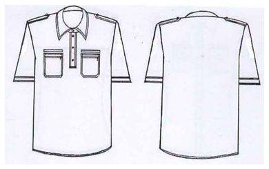 "35. Valsts robežsardzei – tumši zaļas, melnas vai baltas krāsas trikotāžas polo krekls ar īsām iešūtām piedurknēm, vienrindas triju pogu aizdari pa aizdarsloksni. Iešūta apkakle. Krekla priekšdaļā krūšu līmenī uzšūtas divas simetriskas sešstūra krūškabatas ar rāvējslēdzēju. Virs krūšu kabatām katrā pusē 5 mm attālumā uzšūta 120 mm gara un 20 mm plata melna līplente – vieta uzvārda uzšuvei un iestādes uzšuvei. Abos plecgalos iešūts taisnstūra uzplecis. Tā vaļīgais trijstūrgals piepogājams plecvīlei ar pogu. Gar apkakles, uzpleču, kabatu, pārloku, piedurkņu atloku griezto malu, apdarloksnes ārmalām stepēta 3–5 mm plata nošuve. (31.attēls)