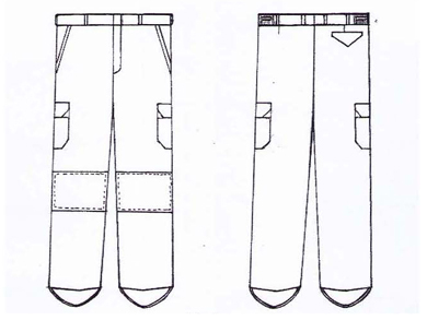 "64. Auduma bikses tumši zilā krāsā. Viduklī piešūta josta ar astoņām cilpām un diviem savilktņiem, aizdare ar rāvējslēdzēju un divām pogām. Priekšdaļā divas iegrieztas sānu kabatas. Bikšu sānu daļā divas uzšūtas kabatas ar pārloku. Bikšu ceļgala vietā uzšūti pastiprinājumi no tāda paša auduma, mugurdaļā viena iegriezta kabata ar pārloku. (59.attēls)