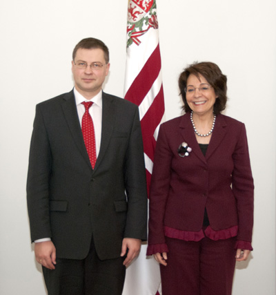| Vakar, 19.aprīlī, darba vizītē Latvijā uzturējās Eiropas Savienības jūras lietu un zivsaimniecības komisāre Marija Damanaki, kura, tiekoties ar Latvijas amatpersonām, tostarp Ministru prezidentu Valdi Dombrovski (attēlā) un zemkopības ministri Laimdotu Straujumu, apsprieda zivsaimniecības politikas reformu, Eiropas Zivsaimniecības fonda nākotni, reģiona intereses, kā arī Latvijas prioritātes ES daudzgadu budžeta kontekstā Foto: Toms Norde, Valsts kanceleja |