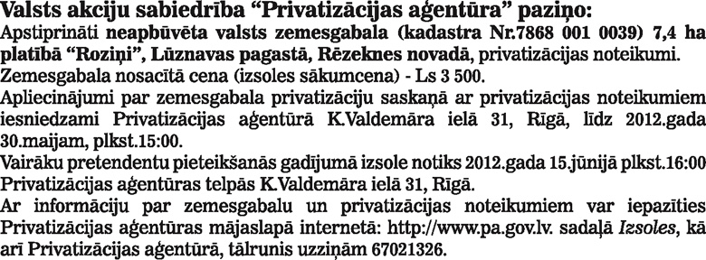 Privatizācijas ziņas. Publicēts oficiālajā laikrakstā "Latvijas Vēstnesis", 24.04.2012., Nr. 63 https://www.vestnesis.lv/ta/id/246902