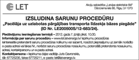 Piegādes un darbu izpildes pasūtījumi. Publicēts oficiālajā laikrakstā "Latvijas Vēstnesis", 17.05.2012., Nr. 76 https://www.vestnesis.lv/ta/id/247824