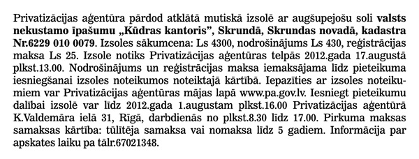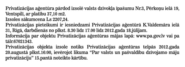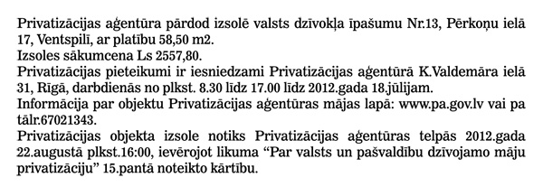 Privatizācijas ziņas. Publicēts oficiālajā laikrakstā "Latvijas Vēstnesis", 29.05.2012., Nr. 83 https://www.vestnesis.lv/ta/id/248299