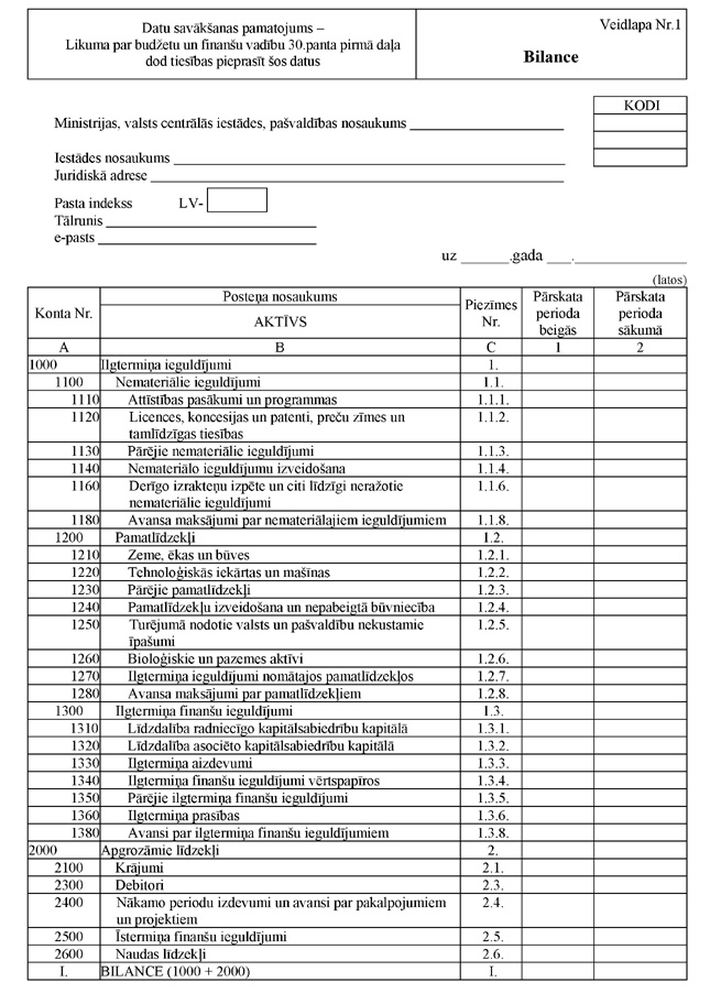 79.1 4. ailē "Aktīva grupas/institucionālā sektora kods/nosaukums" norāda aktīva grupu atbilstoši normatīvajos aktos budžeta grāmatvedības jomā noteiktajam kontu plānam (četrās zīmēs) un tā nosaukumu un institucionālā sektora klasifikācijas kodu un nosaukumu atbilstoši budžeta klasifikāciju jomā noteiktajam sektoram "Vispārējā valdība" septiņās zīmēs;