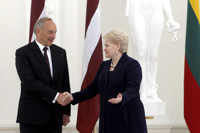 | Lietuvas Republikas prezidente Daļa Grībauskaite 2011.gada 19.jūlijā Viļņā sagaidīja Latvijas Republikas Valsts prezidentu Andri Bērziņu (skat. “LV” nr.112, 20.07.2011.), kurš bija ieradies savā pirmajā oficiālajā ārvalstu vizītē pēc stāšanās amatā. Nu pienākusi kārta būt mājastēvam Latvijas prezidentam Foto: VPK (arhīva foto) |