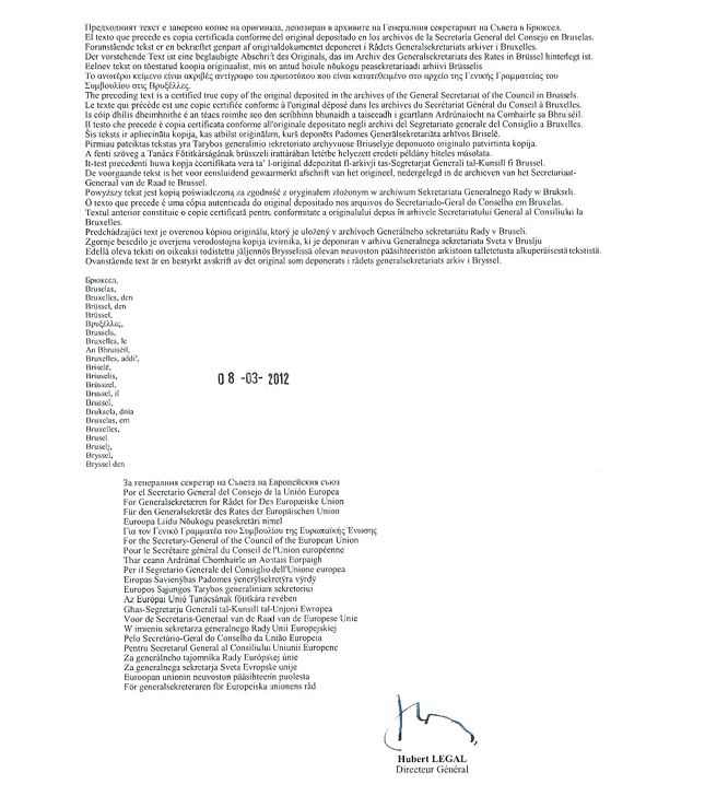 apliecinājis līguma depozitārija pārstāvis Hubert Legal, Padomes ģenerālsekretariāta Juridikā dienesta ģenerāldirektors |