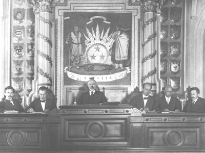 | Latvijas Republikas Satversmes sapulces (01.05.1920.– 07.11.1922.) prezidijs: centrā – Satversmes sapulces priekšsēdētājs Jānis Čakste, pa kreisi – priekšsēdētāja biedri Staņislavs Kambala un Andrejs Petrevics, pa labi – Satversmes sapulces sekretārs Roberts Ivanovs, sekretāra biedri Erasts Bite un Mārtiņš Antons Arhīva foto: Mārtiņš Lapiņš |