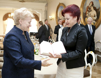 Tikšanās noslēgumā S.Āboltiņa Lietuvas prezidentei uzdāvināja Satversmes jubilejas izdevumu “Latvijas Republikas Satversme”, kurā iekļauts mūsu valsts pamatlikuma tulkojums arī lietuviešu valodā.