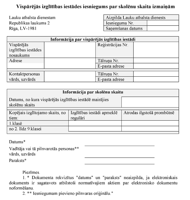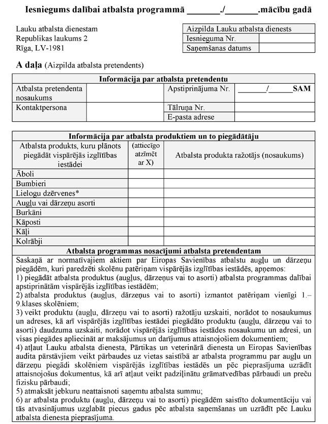 "5.3. kas minēts šo noteikumu 4.1., 4.2. vai 4.3.apakšpunktā, katru gadu līdz 20.septembrim iesniedz Lauku atbalsta dienestā iesniegumu dalībai atbalsta programmā kārtējā mācību gadā (1.1 pielikuma A daļa) un vispārējās izglītības iestādes sagatavotu informāciju par dalību atbalsta programmā kārtējā mācību gadā (1.1 pielikuma B daļa). Lauku atbalsta dienests savā mājaslapā internetā publicē to vispārējās izglītības iestāžu sarakstu, kuras piedalās atbalsta programmā."