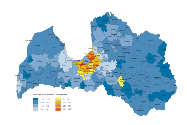 Ekonomikas recesija 2009.gadā visvairāk skāra tieši Rīgas un Pierīgas reģionus (lielāks IKP kritums), kas saistīts izaugsmes gados koncentrēto ekonomisko aktivitāti Rīgā un Pierīgā. Līdz ar to ir saglabājušās būtiskas atšķirības starp reģioniem – 2009.gadā Latgalē IKP uz 1 iedzīvotāju bija tikai 55% līmenī no Latvijas vidējā rādītāja un tikai 33% no IKP uz 1 iedzīvotāju Rīgas reģionā.