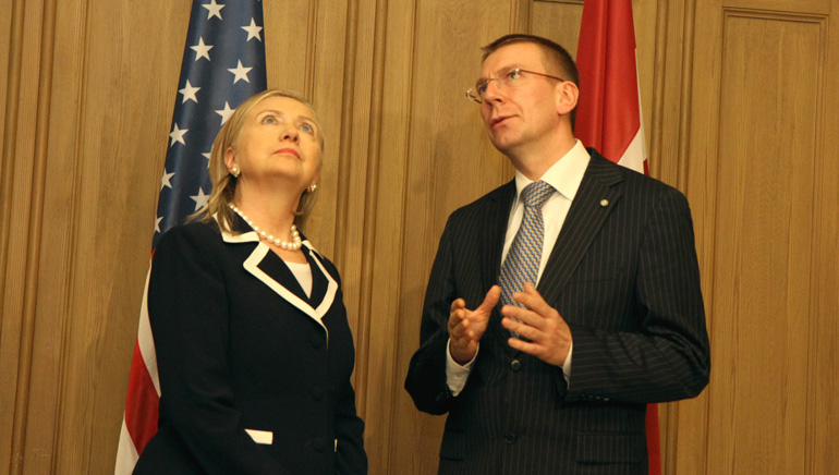 Vakar, 28.jūnijā, Latvijā vizītē uzturējās Amerikas Savienoto Valstu valsts sekretāre Hilarija Klintone, kura vizītes laikā tikās ar Latvijas Valsts prezidentu Andri Bērziņu, Ministru prezidentu Valdi Dombrovski, ārlietu ministru Edgaru Rinkēviču (attēlā), Latvijas Universitātē – ar jauniešiem, kopā ar ārlietu ministru nolika ziedus pie Brīvības pieminekļa Rīgā, kā arī piedalījās Samnera Velsa ielas svinīgajā atklāšanā pie ASV vēstniecības Rīgā Foto: Ārlietu ministrija