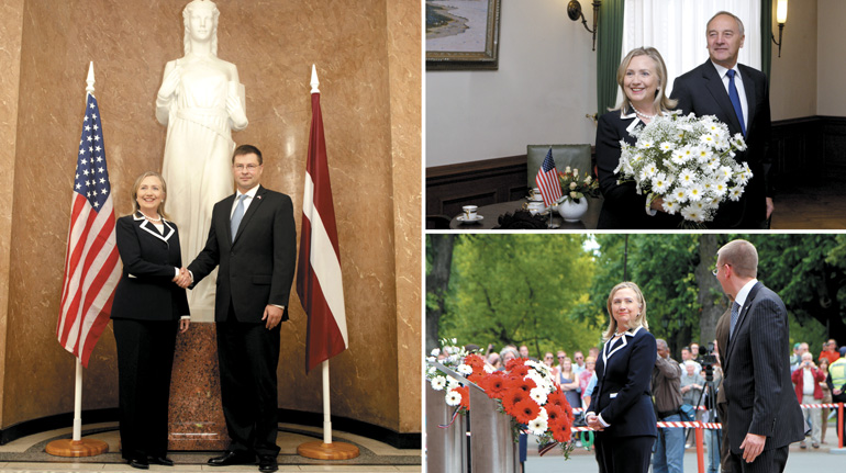 Amerikas Savienoto Valstu valsts sekretāre Hilarija Klintone vizītes laikā Latvijā 28.jūnijā: tiekoties ar Latvijas Valsts prezidentu Andri Bērziņu (augšējā attēlā), Ministru prezidentu Valdi Dombrovski (attēlā pa kreisi) un noliekot ziedus pie Brīvības pieminekļa Rīgā (apakšējā attēlā) Foto: Toms Kalniņš, Valsts prezidenta kanceleja; Toms Norde, Valsts kanceleja; Ārlietu ministrija