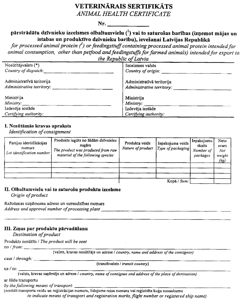 1.3. pārstrādātas dzīvnieku izcelsmes olbaltumvielas un to saturošu barību (izņemot mājas un istabas dzīvnieku un produktīvo dzīvnieku barību) ar veterināro sertifikātu “pārstrādātu dzīvnieku izcelsmes olbaltumvielu (1) vai to saturošas barības (izņemot mājas un istabas dzīvnieku un produktīvo dzīvnieku barību) ievešanai Latvijas Republikā” (3. pielikums).