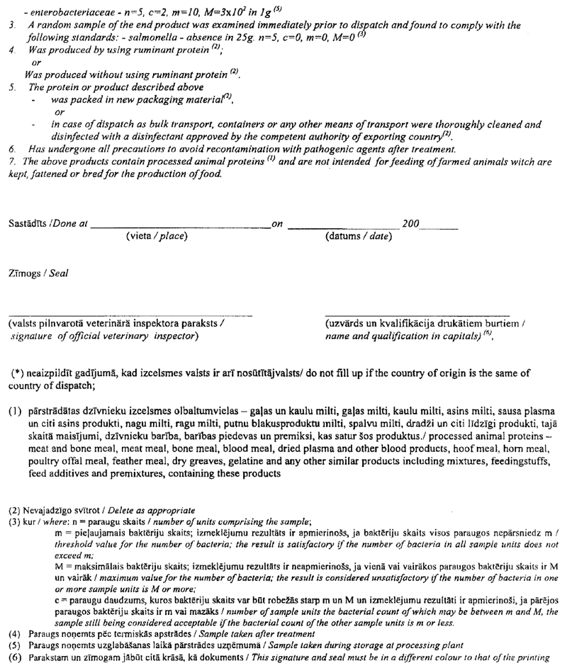 1. No 2001. gada 9. jūlija Latvijas Republikā atļaut ievest dzīvnieku izcelsmes olbaltumvielas ar sekojošiem eksportētājvalsts pilnvarotas institūcijas izdotajiem noteikta parauga veterinārajiem sertifikātiem: