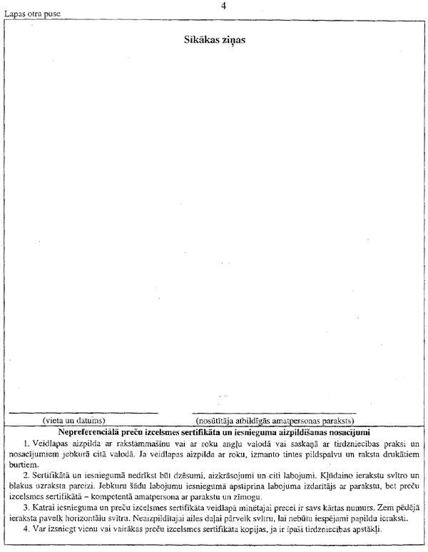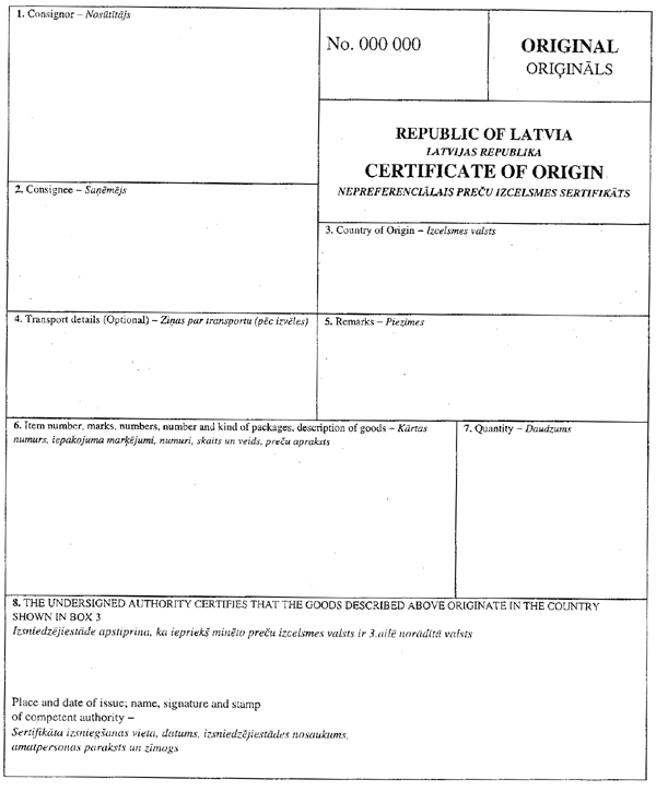 6. Nepreferenciālā preču izcelsmes sertifikāta (1.pielikums) veidlapas formāts ir A4 (210 x 297 mm). Ir pieļaujama -5 mm vai +8 mm atkāpe no noteiktā izmēra. Izmantojams balts rakstāmpapīrs (bez mehāniskiem celulozes piemaisījumiem), kas sver vismaz 25 g/m2. Sertifikātam ir sarkanbrūns fons ar pītu lentīšu reljefu, lai būtu iespējams atklāt mehāniskus vai ķīmiskus viltojumus.
