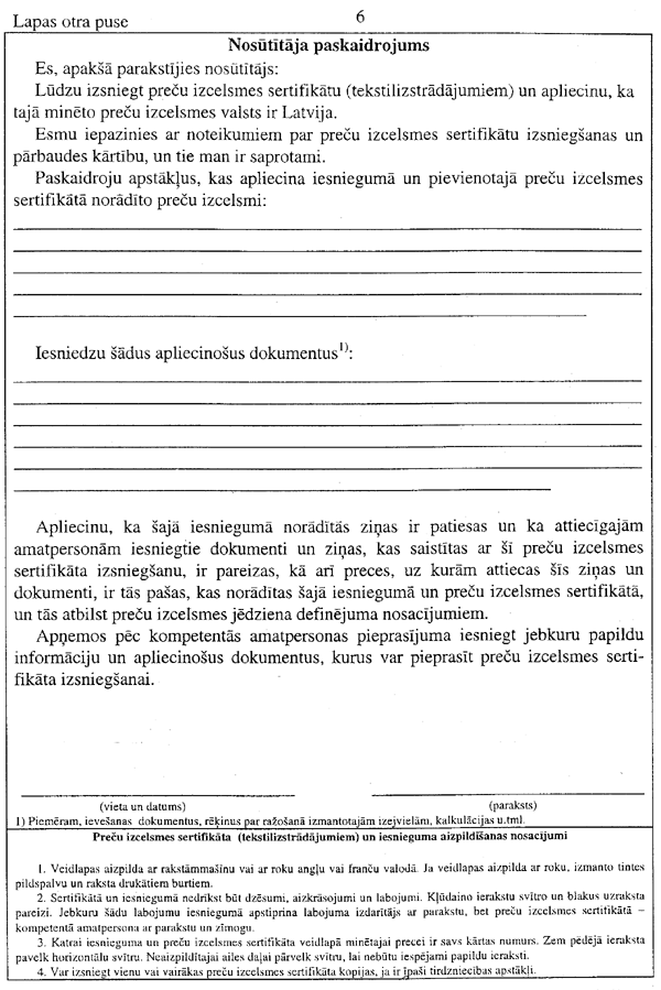 Preču izcelsmes sertifikāta (tekstilizstrādājumiem) veidlapa un iesniegums sertifikāta saņemšanai