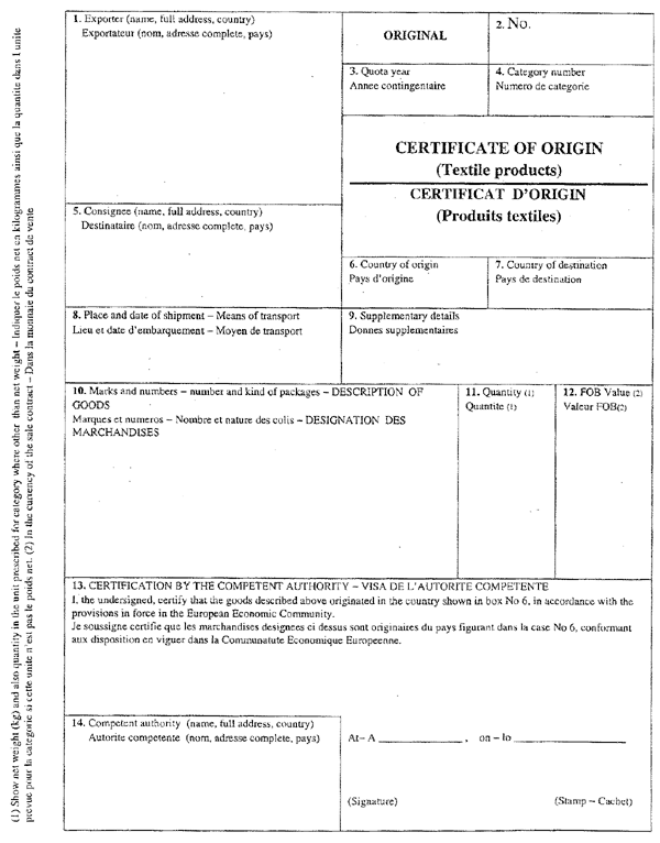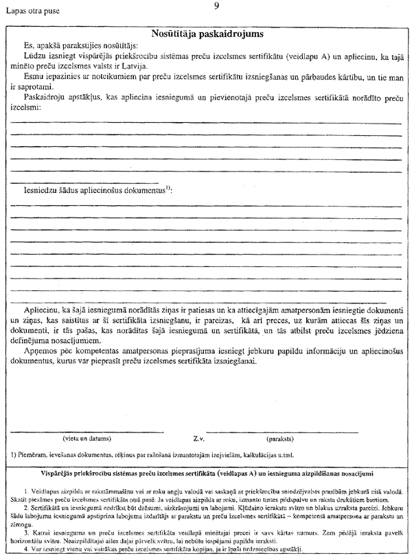 9. Preču izcelsmes sertifikāta (tekstilizstrādājumiem) iesniegums un vispārējās priekšrocību sistēmas preču izcelsmes sertifikāta (veidlapas A) iesniegums ir latviešu valodā. Preču izcelsmes sertifikāta (tekstilizstrādājumiem) oriģināls ir angļu un franču valodā. Vispārējās priekšrocību sistēmas preču izcelsmes sertifikāta (veidlapas A) oriģināls ir angļu vai franču valodā.