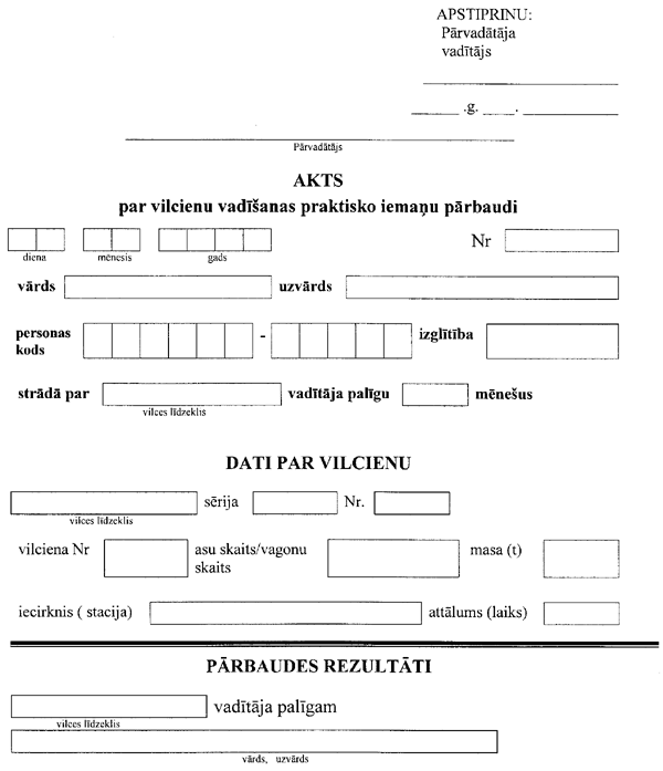 21. Mašīnists-instruktors pārbauda mašīnistu praktiskās iemaņas vilces līdzekļa vadīšanā pa attiecīgajiem sliežu ceļiem reizi trijos mēnešos un formulārā ieraksta: