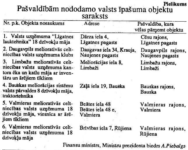 Pamatojoties uz Augstākās Padomes 1991.gada 20.marta lēmuma "Par valsts īpašumu un tā konversijas pamatprincipiem" 4.punktu, kā arī ievērojot Zemkopības ministrijas un pašvaldību savstarpējo vienošanos, atļaut Zemkopības ministrijai - valsts īpašuma pārvaldītājai - nodot attiecīgo pašvaldību īpašumā valsts īpašuma objektus saskaņā ar pielikumu.