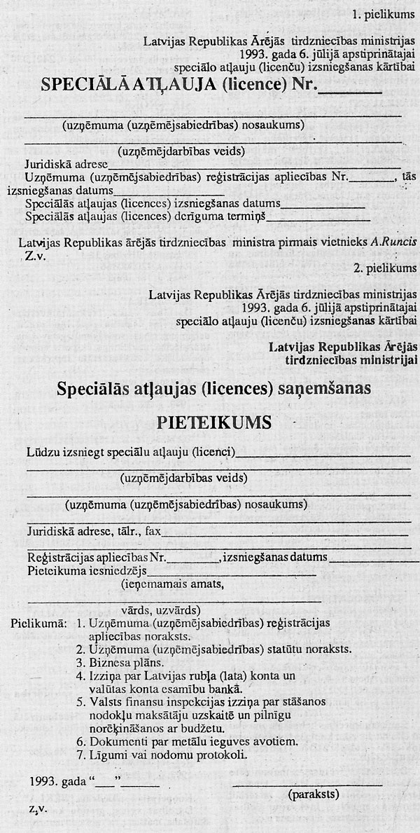 1. Saskaņā ar Latvijas Republikas Ministru Padomes 1993. gada 27. maija lēmumu Nr. 266 speciālās atļaujas (licences) melno un krāsaino metālu lūžņu iepirkšanai Latvijas Republikā un Latvijā iepirkto melno un krāsaino metālu eksportam izsniedz Latvijas Republikas Arējās tirdzniecības ministrija.