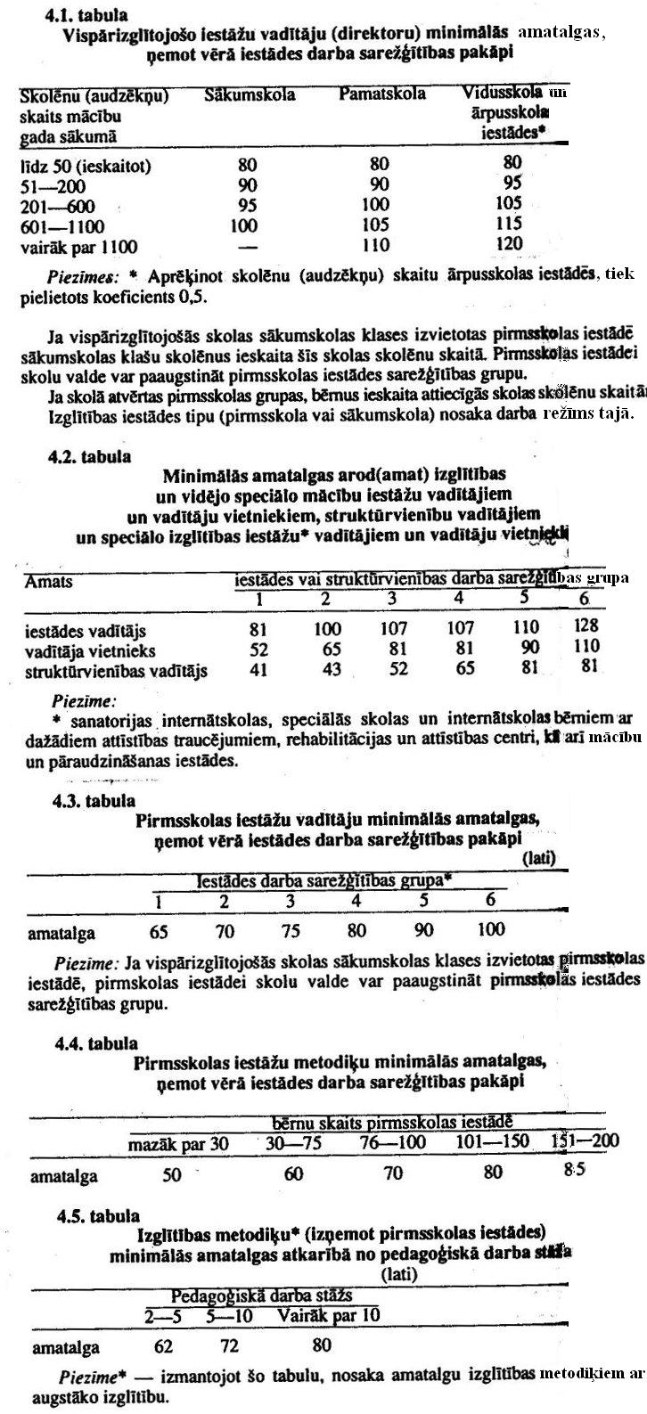 Amatalgas šajā punktā iepriekšminētajām pedagoģisko darbinieku kategorijām, kā arī izglītības iestāžu vadītāju vietniekiem, struktūrvienību vadītājiem, izglītības iestāžu metodiķiem nosaka saskaņā ar tabulām 4.2.; 4.3.; 4.4.; 4.5.
