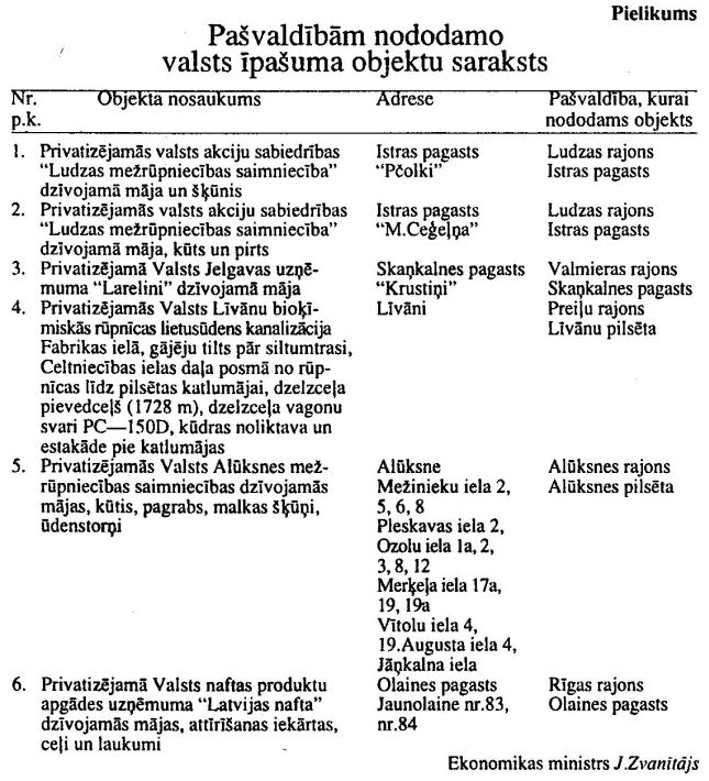 Saskaņā ar likuma “Par valsts un pašvaldību īpašuma objektu privatizāciju” (Latvijas Vēstnesis, 1994, 27., 77.nr.) 53.panta sesto daļu, likumu “Par valsts un pašvaldību dzīvojamo māju privatizāciju” (Latvijas Vēstnesis, 1995, 103.nr.), kā arī ievērojot Privatizācijas aģentūras un attiecīgo pašvaldību savstarpējo vienošanos, atļaut Privatizācijas aģentūrai — valsts īpašuma valdītājai — nodot pašvaldību īpašumā valsts īpašuma objektus saskaņā ar pielikumu.