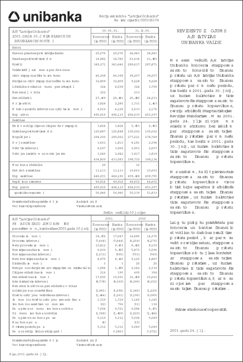 Seši mēneši līdz 30.jūnijam Mēs esam veikuši A/s Latvijas Unibanka koncerna starpposma saīsināto konsolidēto finansu pārskatu un A/s Latvijas Unibanka starpposma saīsināto finansu pārskatu par 6 mēnešu periodu, kas beidzās 2001. gada 30. jūnijā, uz kuriem balstoties ir ticis sagatavots šis starpposma saīsināto finansu pārskatu kopsavilkums, revīziju atbilstoši Starptautiskajiem Revīzijas Standartiem. Mūsu 2001. gada 24. jūlija ziņojumā mēs sniedzām atzinumu bez iebildēm par starpposma saīsinātajiem finansu pārskatiem par 6 mēnešu periodu, kas beidzās 2001. gada 30. jūnijā, uz kuriem balstoties ir ticis sagatavots šis starpposma saīsināto finansu pārskatu kopsavilkums.