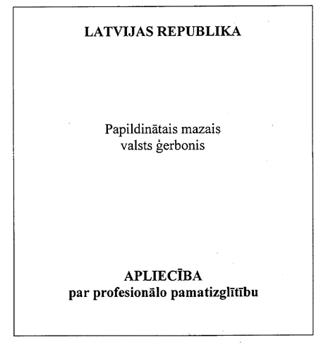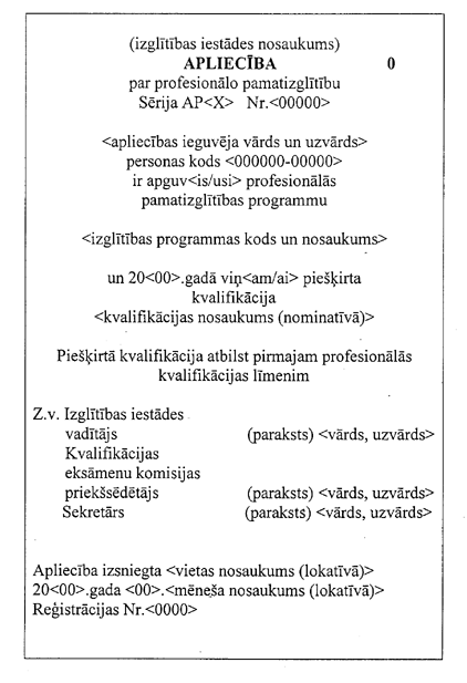 2. Leņķiekavās norādīto informāciju ieraksta vai iespiež atbilstoši katram konkrētajam gadījumam. Pārējais tests ir iespiests un identisks visās apliecībās par profesionālo pamatizglītību.