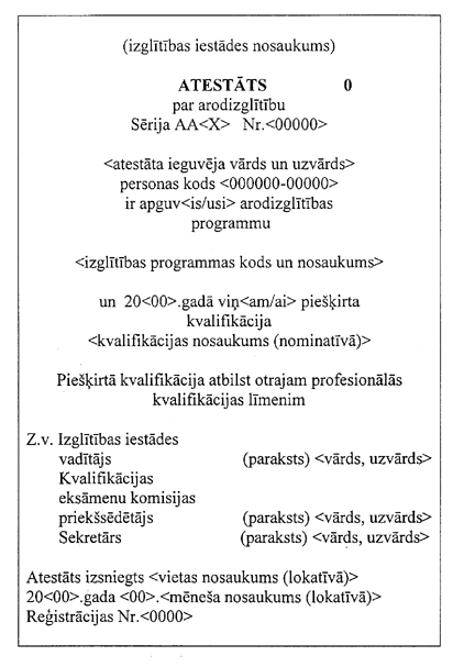 2. Leņķiekavās norādīto informāciju ieraksta vai iespiež atbilstoši katram konkrētajam gadījumam. Pārējais tests ir iespiests un identisks visos atestātos par arodizglītību.