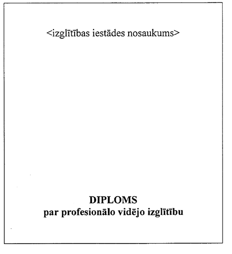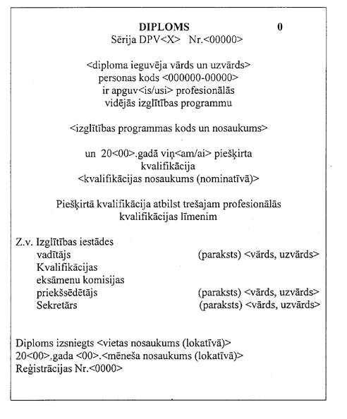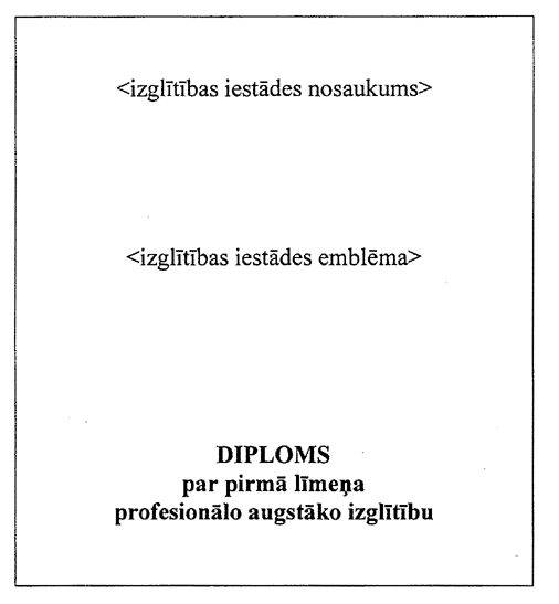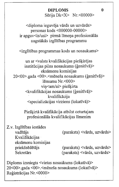 2. Leņķiekavās norādīto informāciju ieraksta vai iespiež atbilstoši katram konkrētajam gadījumam. Pārējais tests ir iespiests un identisks visos diplomos par pirmā līmeņa profesionālo augstāko izglītību.