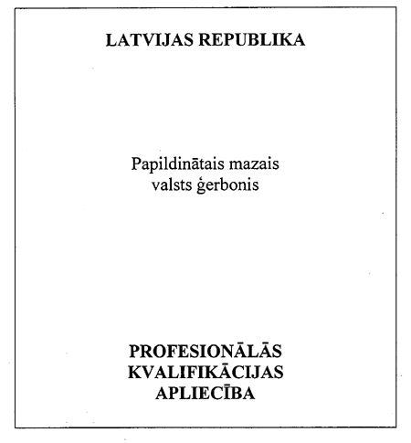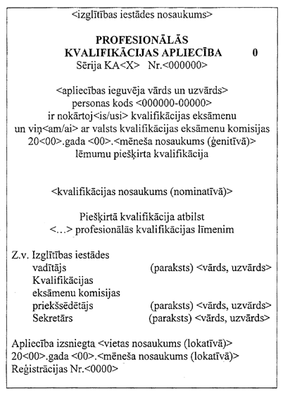 2. Leņķiekavās norādīto informāciju ieraksta vai iespiež atbilstoši katram konkrētajam gadījumam. Pārējais tests ir iespiests un identisks visās profesionālās kvalifikācijas apliecībās.