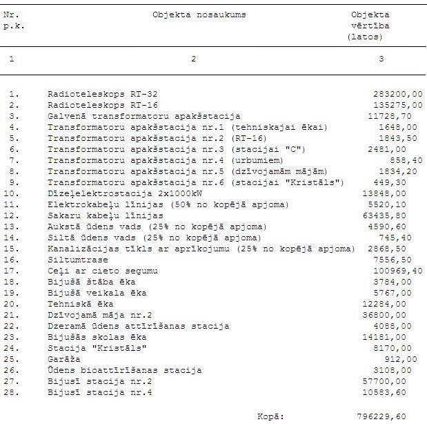 Valsts zinātniskās bezpeļņas organizācijas sabiedrības ar ierobežotu atbildību “Ventspils starptautiskais radioastronomijas centrs” statūtu fondā ieguldītie valsts īpašuma objekti