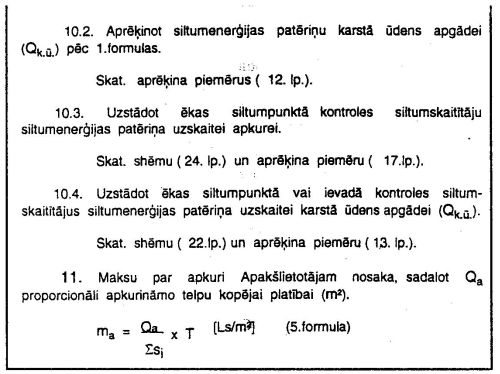 Lietotājs sadala kopējo ēkā izlietoto siltumenerģijas daudzumu (Qk) ēkas dzīvokļu īrniekiem, īpašniekiem un nomniekiem (Apakšlietotāji) saskaņā ar šo instrukciju, par katru mēnesi aprēķinot maksu par 1m2 dzīvokļa kopējās platības apkuri un maksu par karstā ūdens patēriņu vienam iedzīvotājam, kā arī, ja Apakšlietotājam ir uzstādīti karstā ūdens skaitītāji, – aprēķinot maksu par 1m3 karstā ūdens patēriņu.