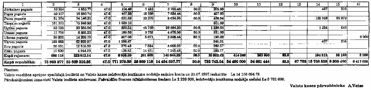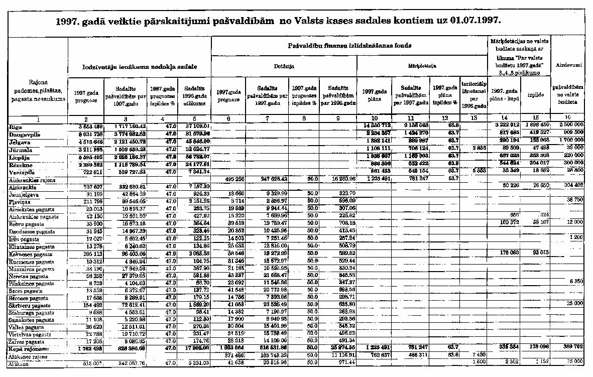 Par 1997.gadā pašvaldībām veiktajiem pārskaitījumiem no Valsts kases sadales kontiem. Publicēts oficiālajā laikrakstā "Latvijas Vēstnesis", 9.07.1997., Nr. 178 https://www.vestnesis.lv/ta/id/29981