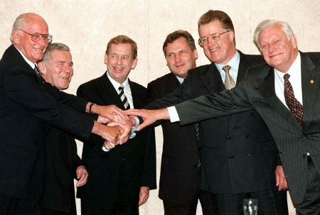 Lai turamies vienkop un balstām cits citu! No kreisās: Igaunijas prezidents Lennarts Meri, Ungārijas premjerministrs Gjula Horns, Čehijas prezidents Vāclavs Havels, Polijas prezidents Aleksandrs Kvašņevskis, Latvijas Valsts prezidents Guntis Ulmanis, Lietuvas prezidents Aļģirds Mīkols Brazausks