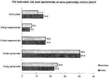 Ar intīmo dzīvi apmierināti ap 60% (sievietes 65%, vīrieši 63 %). Katrs piektais Latvijas iedzīvotājs nav apmierināts ar savu intīmo dzīvi. Vairāk kā 10% nav snieguši noteikti atbildi.