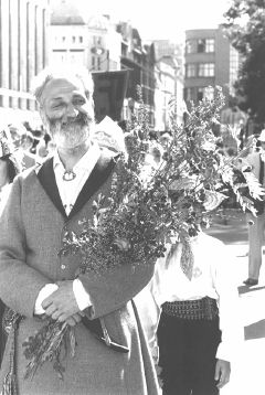 Vakar pēcpusdienā “Baltica `97” dalībnieku svinīgajā gājienā Rīgas centrā: Norvēģijas tautas deju grupas “Sotra Folkedanslag” dalībnieki, Madonas tautas vērtes kopas “Vērtumnieki” maestro Raitis Kumsārs un Lietuvas Veterinārās akadēmijas ansambļa “Kupole” saime pie Brīvības pieminekļa.
